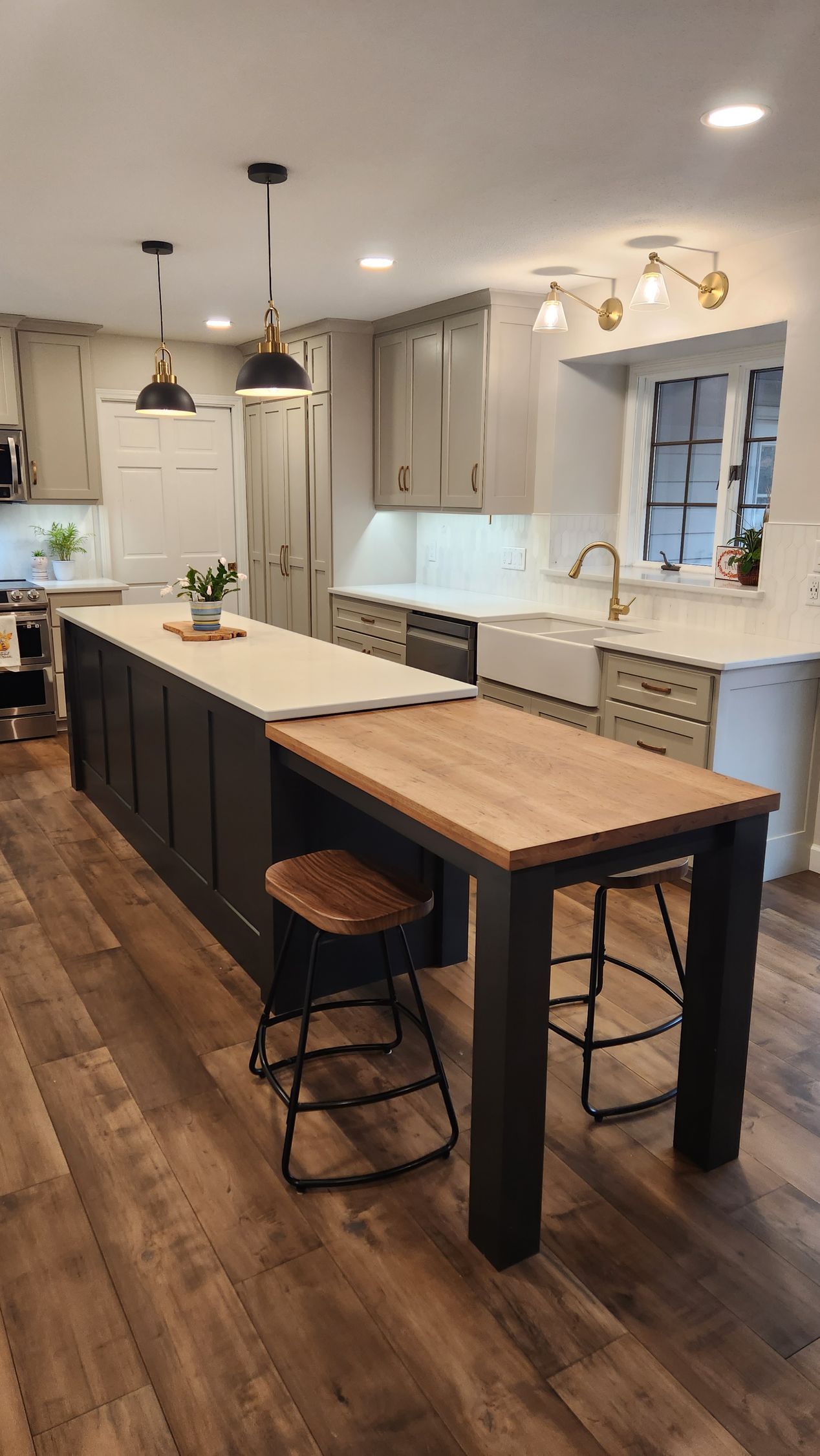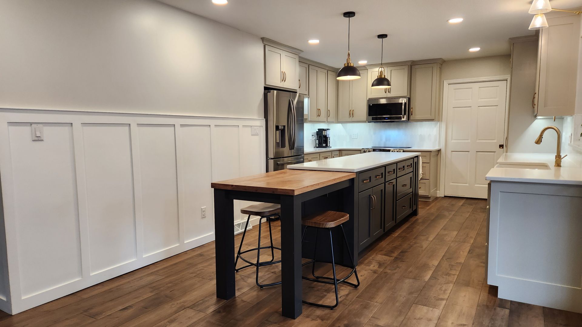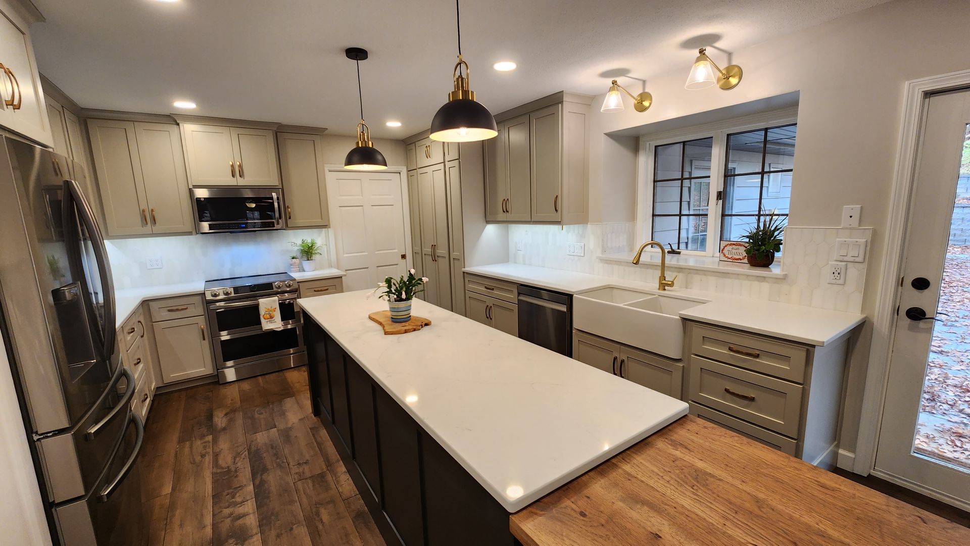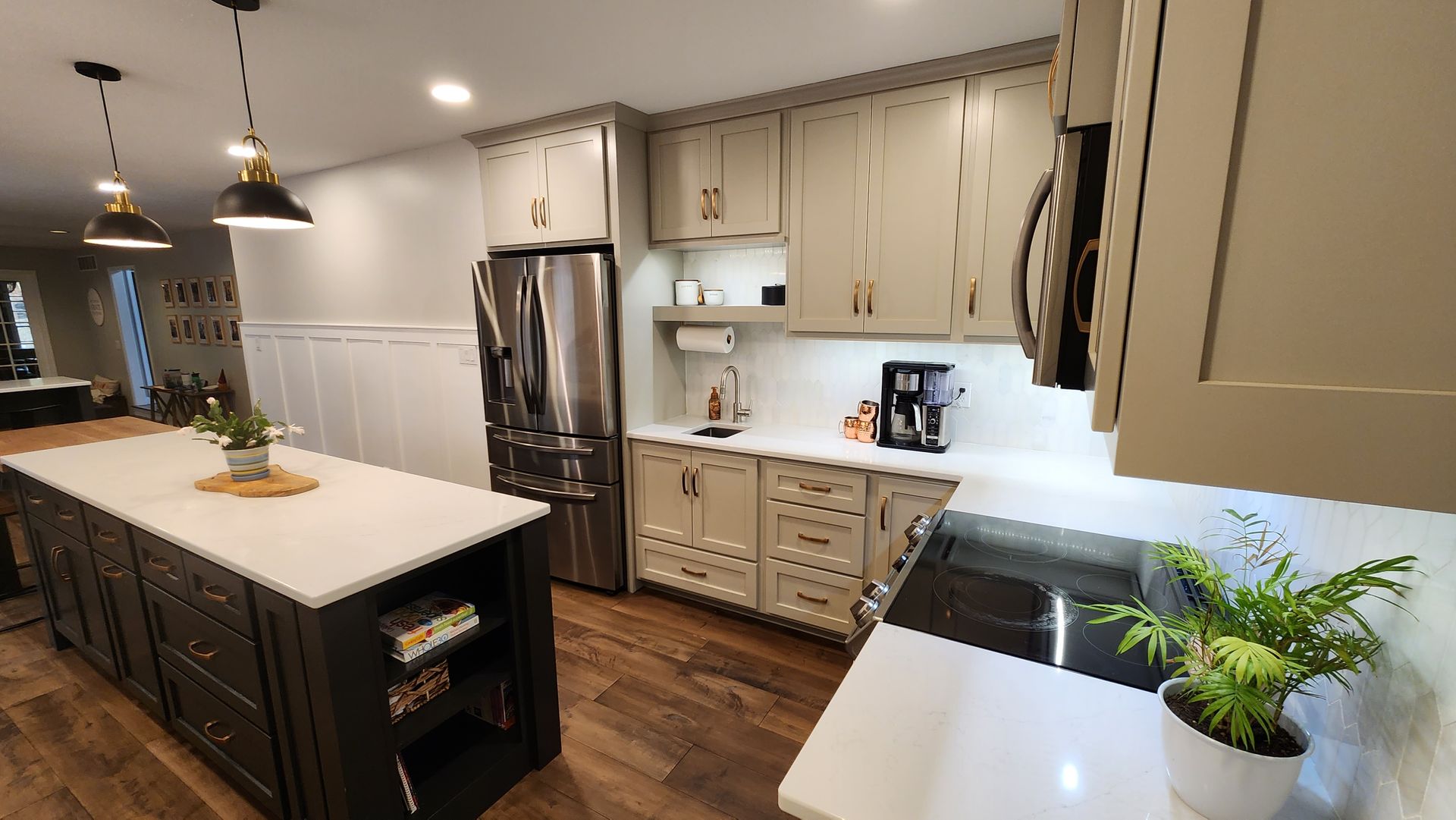 - Cabinetry: New custom shaker-style cabinets in a soft, neutral tone paired with a contrasting dark island for a striking, balanced look.