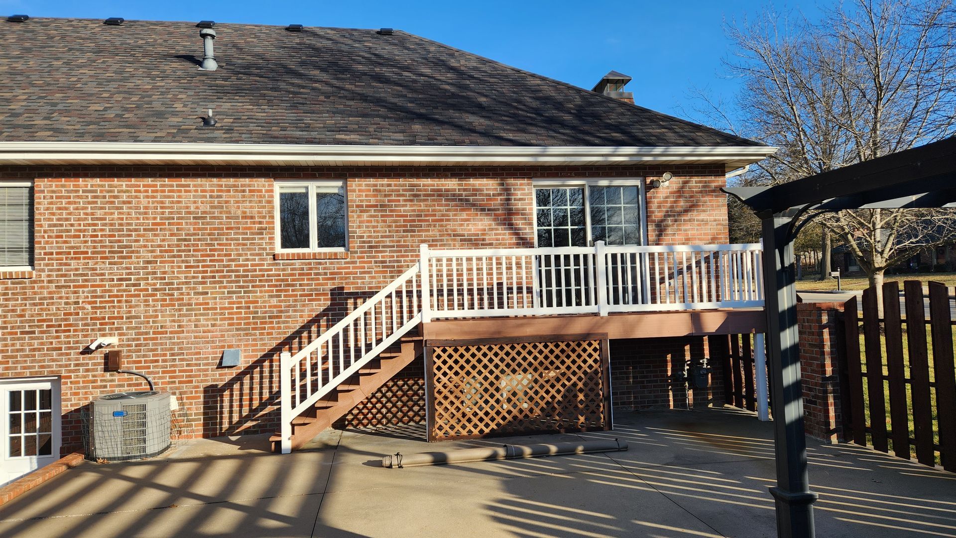 This project involved transforming the home’s rear exterior by removing the existing small deck and replacing it with a new, larger room addition that blends seamlessly with the original brick structure.